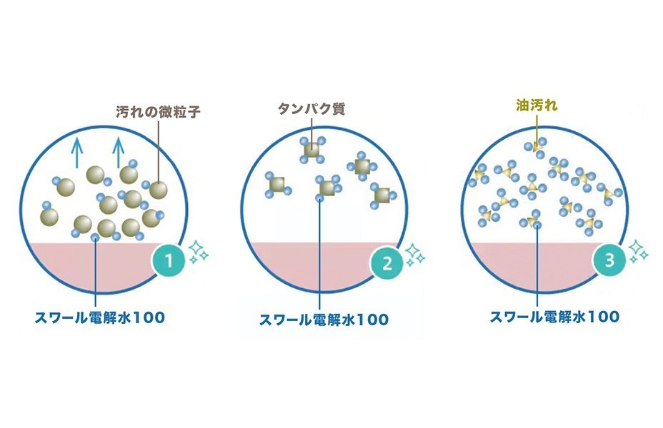 電気分解により細分化された水のクラスター(分子集合体)が器具の細部まで浸透し、汚れを浮かせて分解します。