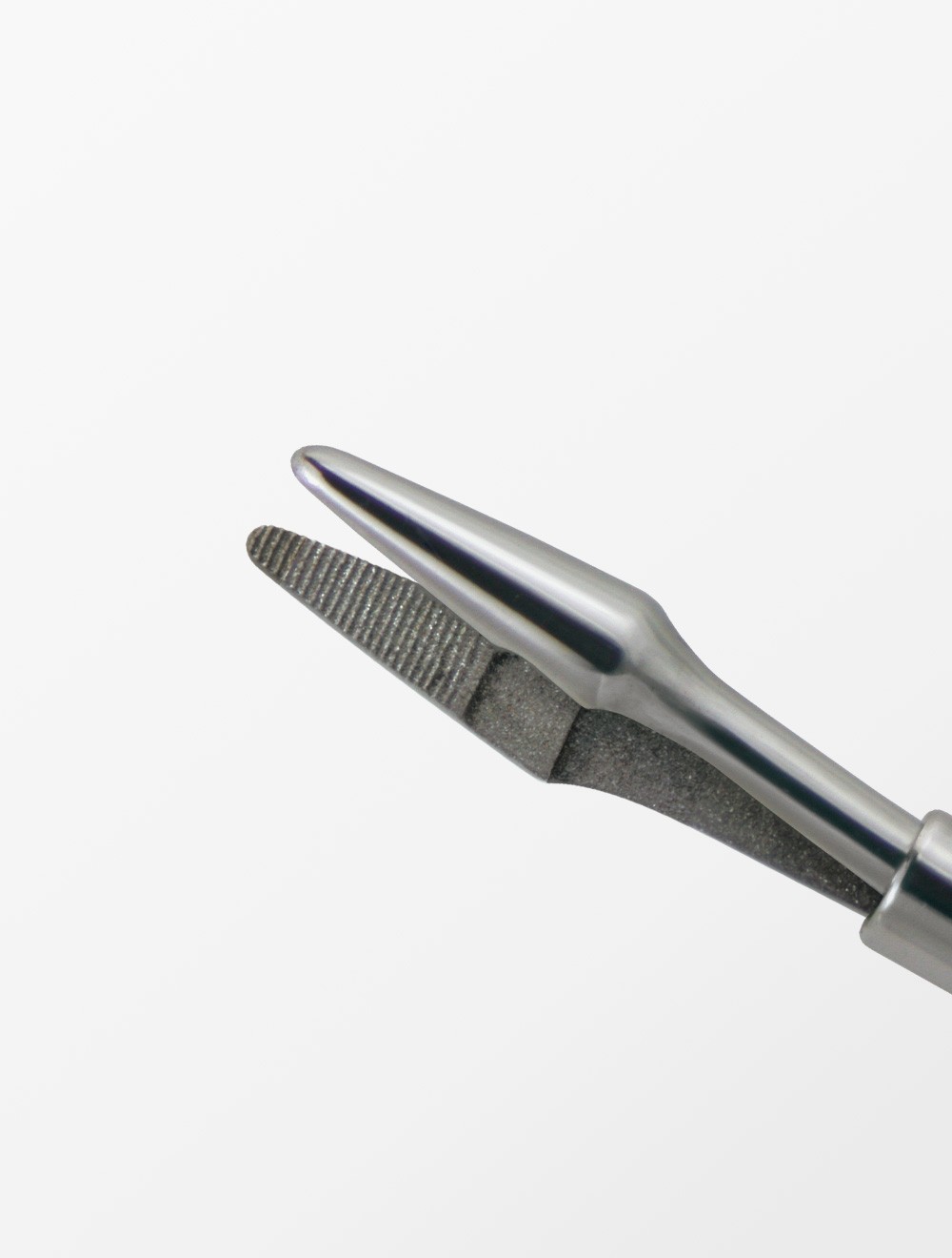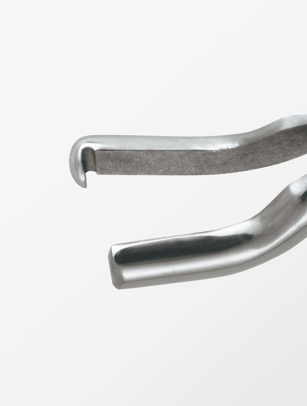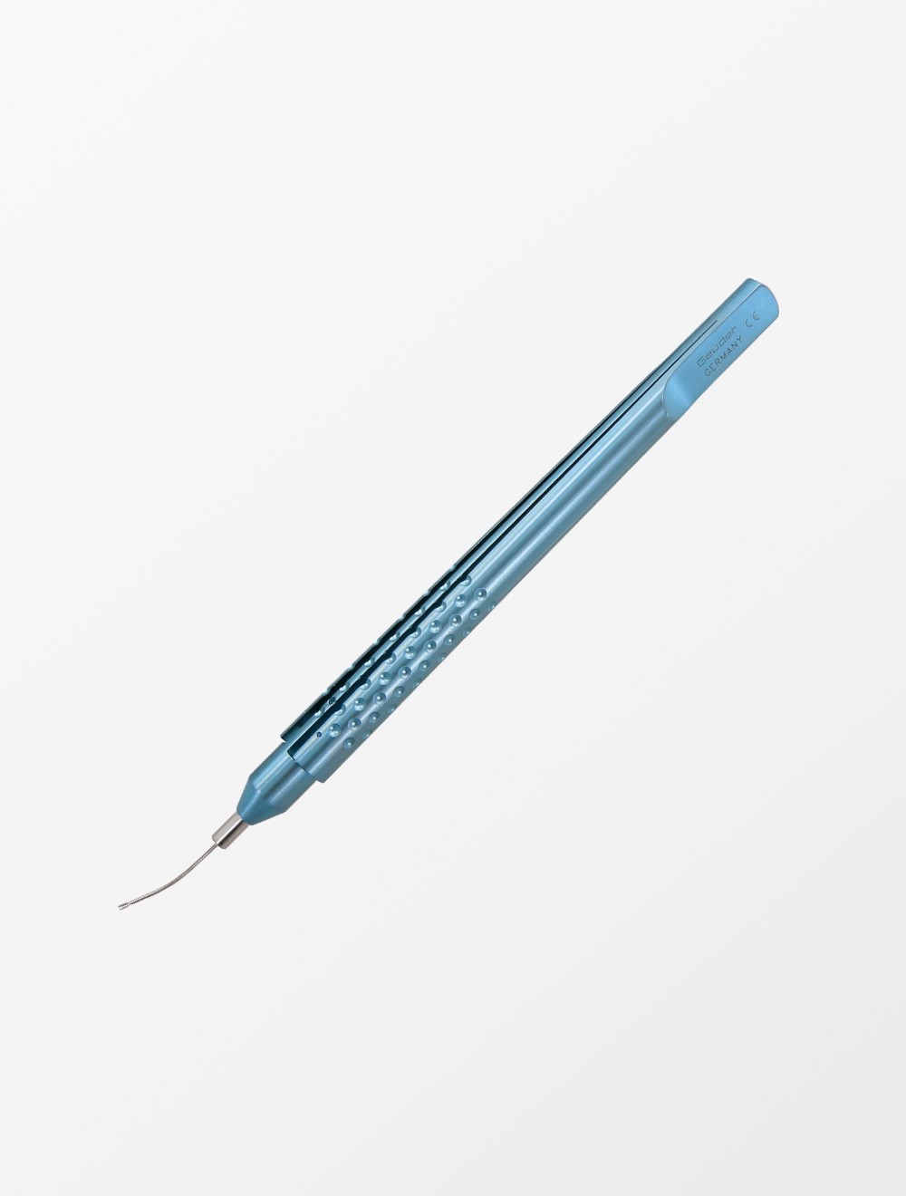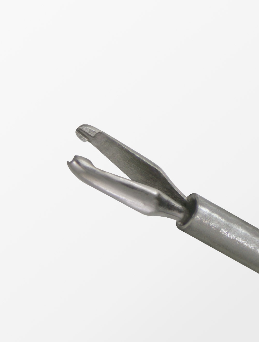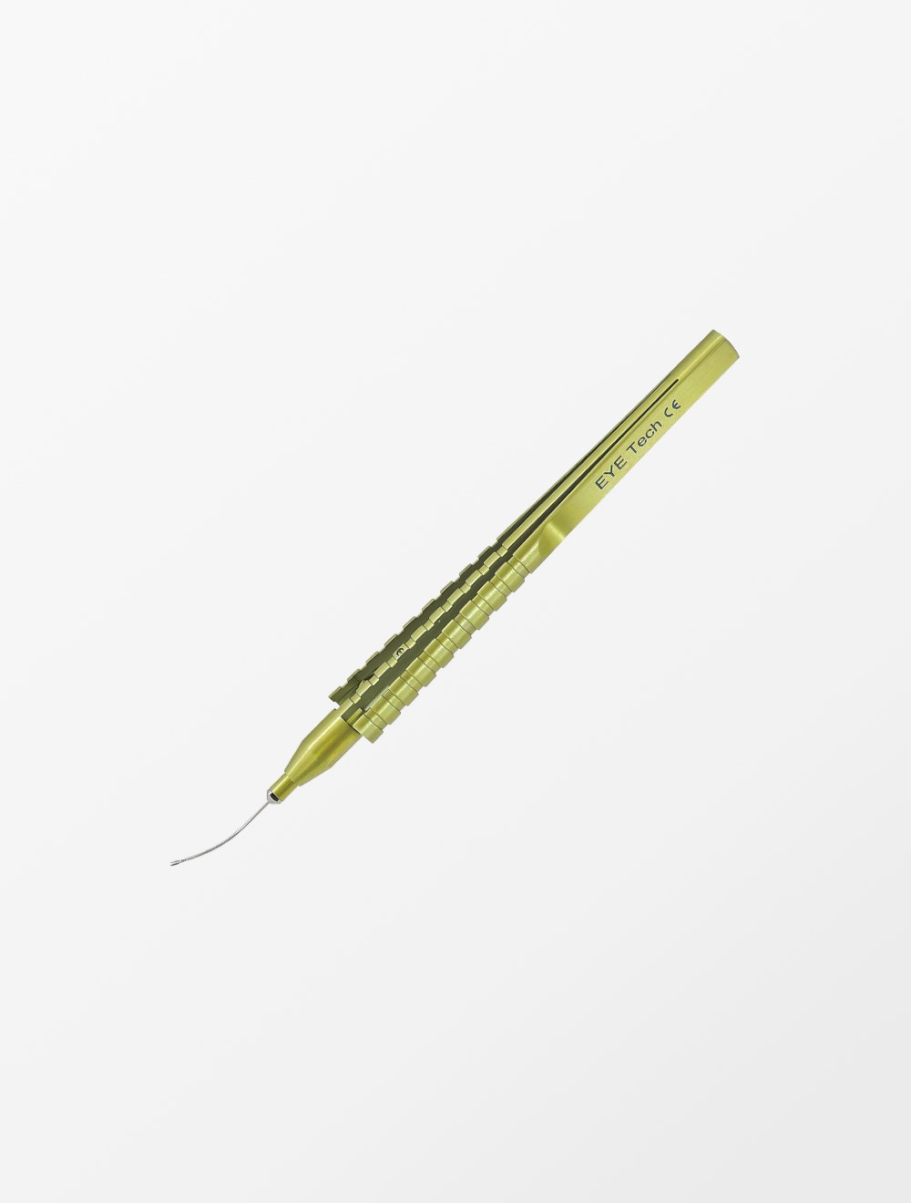 山根氏ダブルニードル・スタビライザーは、強膜切開刺入ポイントのマーキングを容易にし、強膜トンネル作製時のより確実な操作を可能にします。リングに設けられた突起が、眼球をしっかりと固定します。