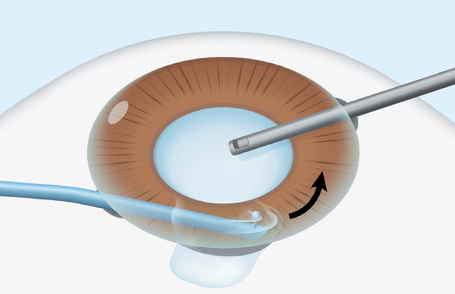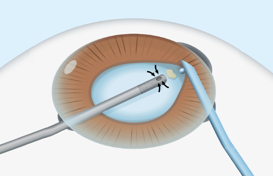 灌流を行いながらフックで虹彩を拡張し虹彩下の皮質を吸引します。