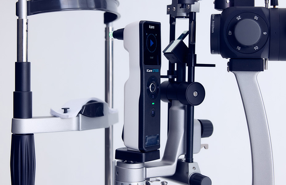 iCare ST500は、リバウンドテクノロジーを用いた"反跳式手持眼圧計"です。極小のプローブを角膜に射出し、その跳ね返りの速度から眼圧を算出します。プローブの角膜への接触は一瞬で痛みもないため、麻酔薬は必要ありません。