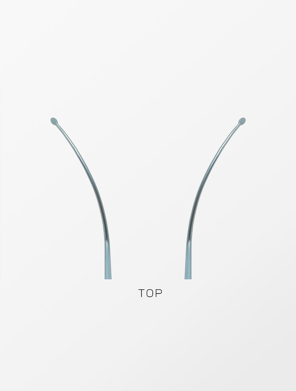 ハンドル両端のシャフトはそれぞれ左右対称に弯曲しており、オリーブ形のチップ底面にはサンドブラスト加工が施されています。ICL挿入用に作成した角膜切開創より挿入して4箇所のフットプレートの固定操作を行います。