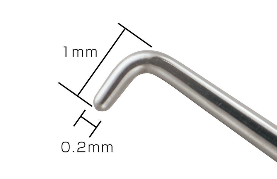 低侵襲緑内障手術(MIGS)専用の器具として開発された、谷戸氏ab internoトラベクロトミーマイクロフックの先端を長く(1mm)鈍に加工した製品です。フックを長く鈍にしたことで、シュレム管に入った感覚がより明確になること、シュレム管内での操作が安定すること、シュレム管外壁に接触した場合にも出血しにくく、出血した場合にも視認性が良く切開操作を続けられるなどの利点があります。