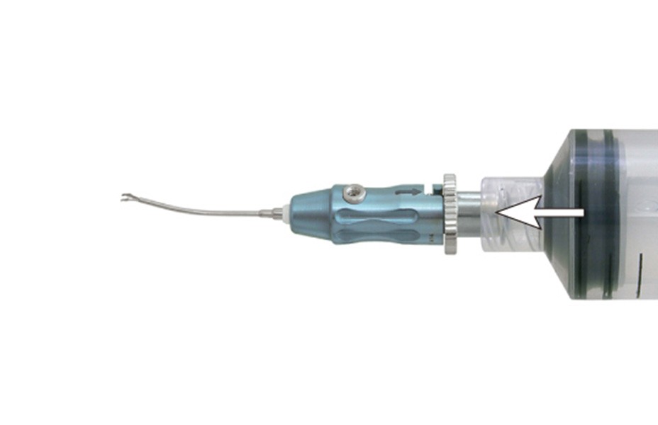 チップ後部にクリーニングアダプタを取り付け、洗浄水を満たしたシリンジを接続して 通水します。洗浄液はパイプ内部を通過・洗浄してシャフト先端より排出されます。