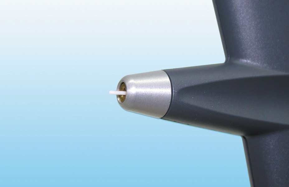 測定ボタンを押すとプローブが角膜に一瞬、接触します。この操作を6回繰り返すことで測定は終了です。