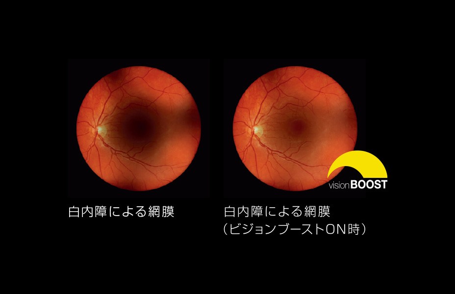 ビジョンブーストをONにすると、通常時の最大光量から、光量が245%UPします。水晶体の混濁により眼底が見えにくい場合などに使用すると、鮮明に眼底を観察することができます。