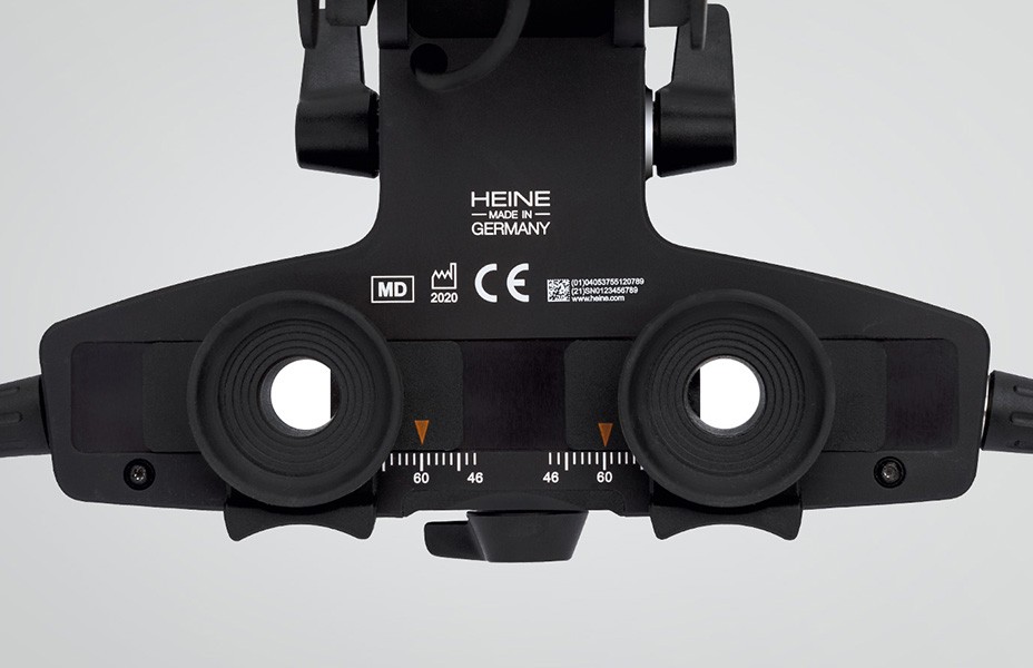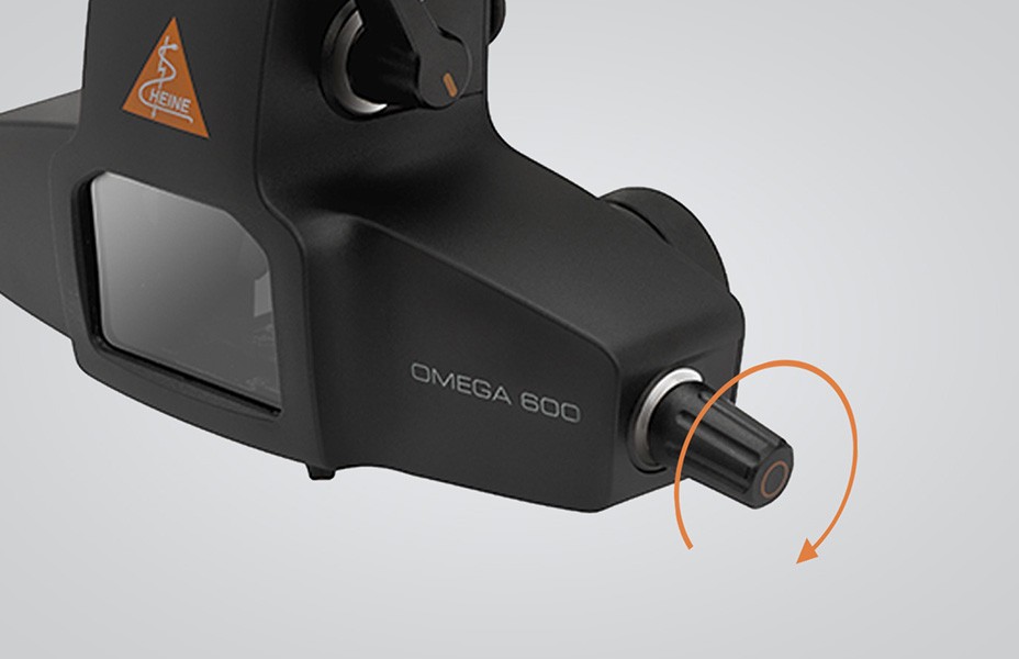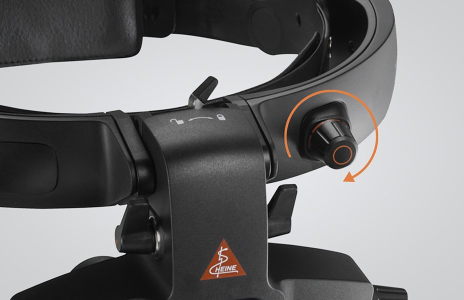 瞳孔径に応じて行う照明光と視差の収束調節を、ハイネ独自の「シンクロナイズドシステム」によりレバー1つで行います。収束を最大にすることで小瞳孔眼の両眼視観察が行えます。