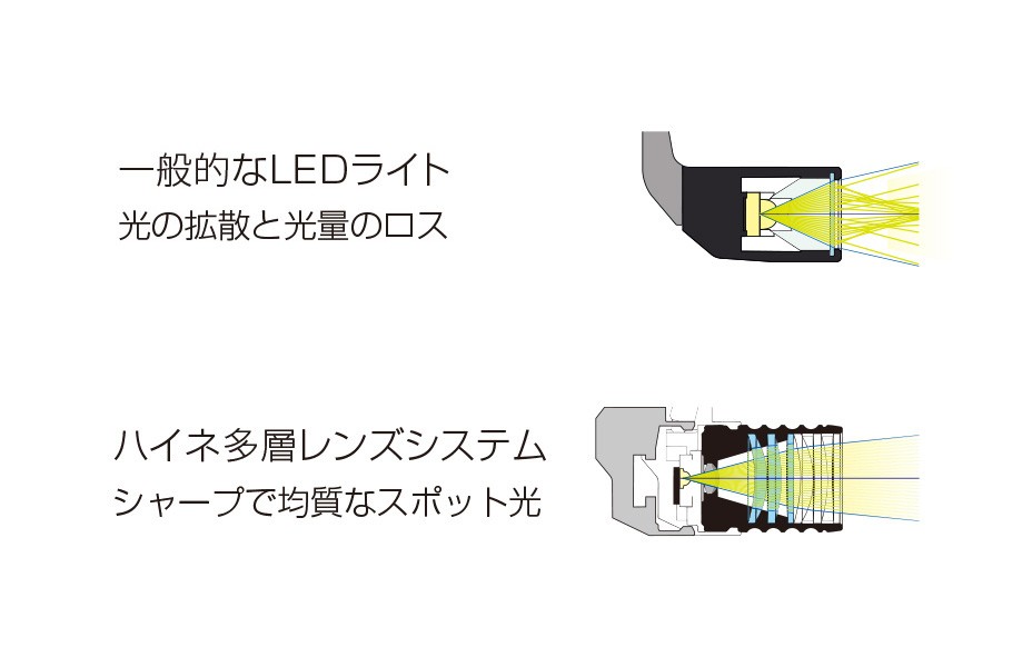 4層のレンズシステムがシャープな輪郭のスポット光を形成し、観察部位を明るく均一に照射します。