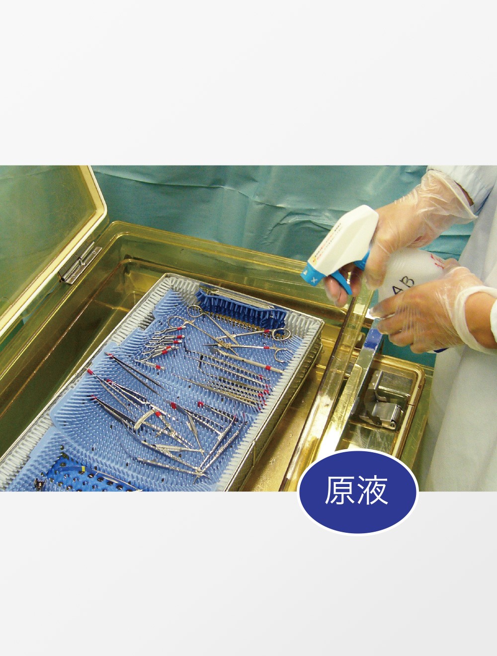 高濃度の電解アルカリイオン水(pH12.5以上)が汚れの細部に浸透し、タンパク質や血液、ヒアルロン酸などの汚れを分解して浮き上がらせます。高い浸潤効果により、器具接合部の狭い部分にも効果があります。