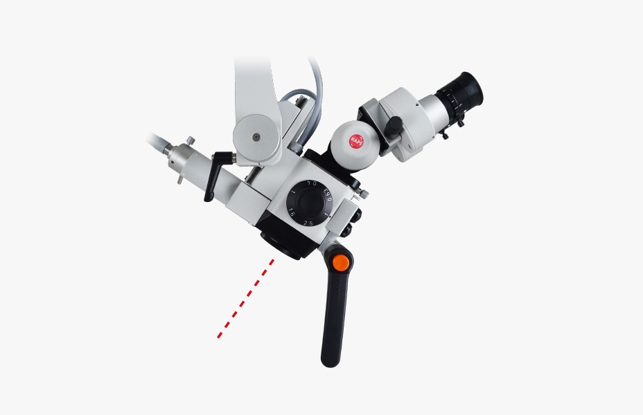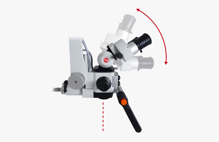 光学部全体を前後にチルトさせることで、様々な手術への対応が可能になります。可動式マイクロスコープの鏡筒の角度調節機能はこのような場合にも有効です。
