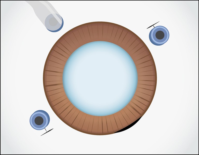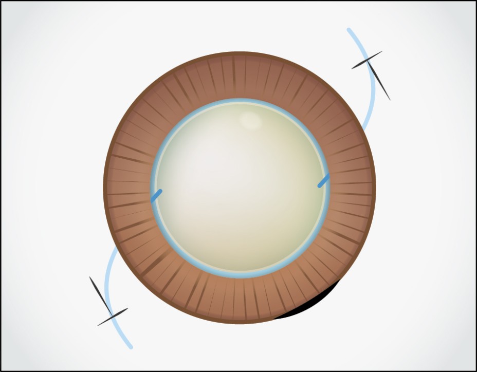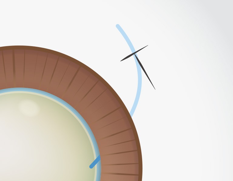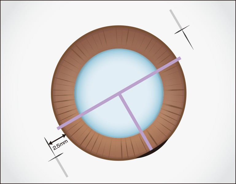 角膜輪部から2.5mmの位置に強膜半層T字切開と強膜トンネルを作製し、直交する位置にIOL挿入用強角膜切開創を作製します。