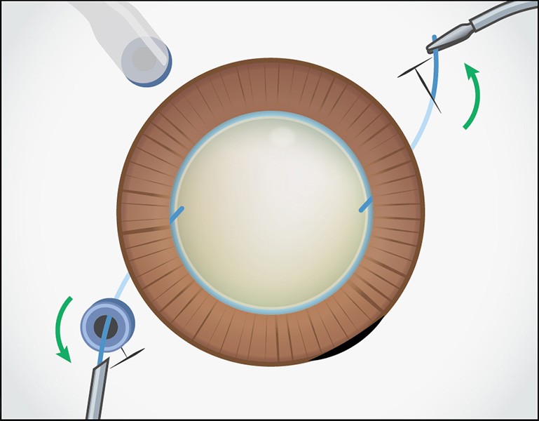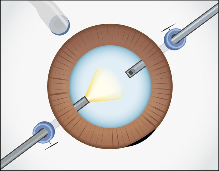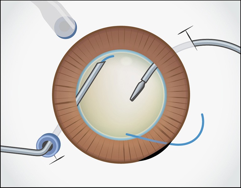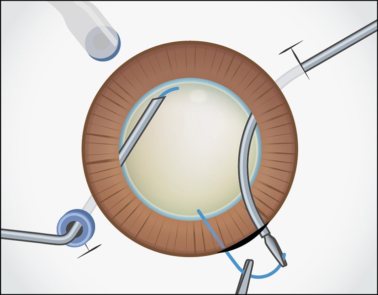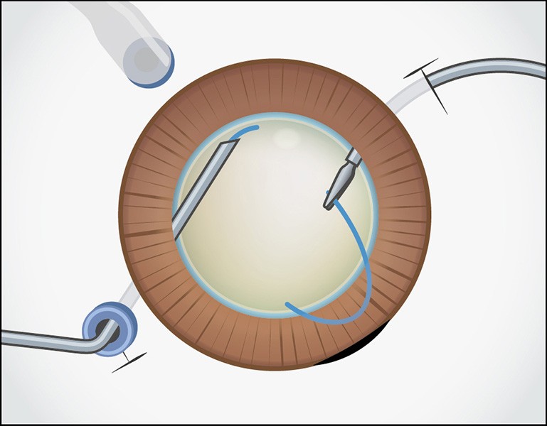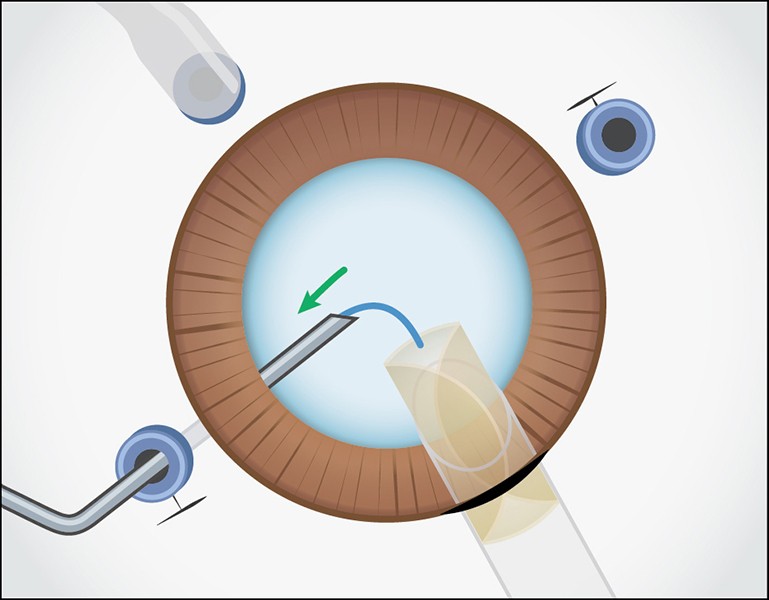 先行支持部は眼内に、後方支持部は眼外に留置しておきます。右手側のトロッカーを抜去し、眼外ガイド用強膜内固定鑷子を眼内に挿入します。
