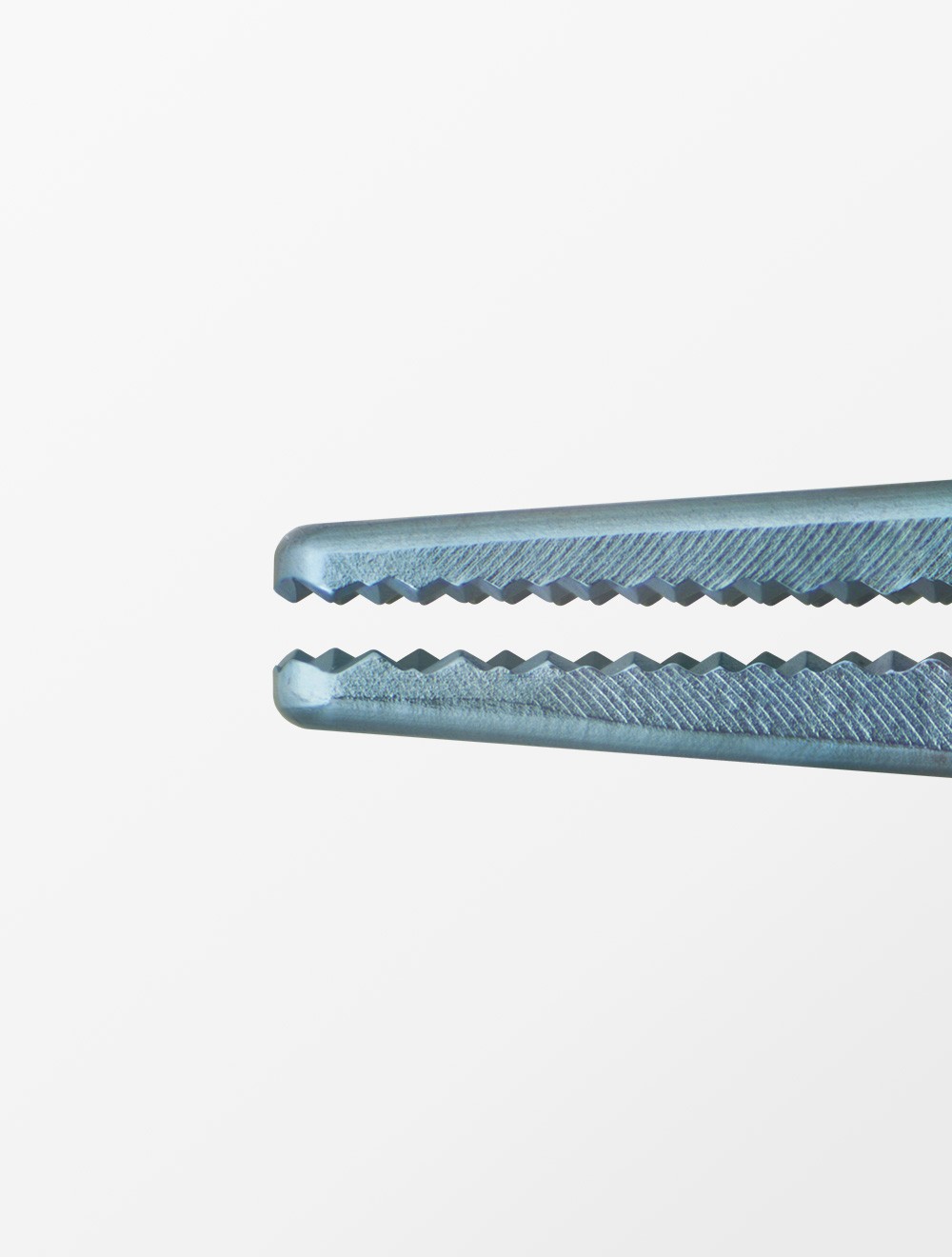 チップの内側には滑らかに仕上げられたピラミッド状の突起が並び、先端を閉じた際それぞれがかみ合う精緻な仕上がりとなっています。そのため、組織の挫滅を最小限に抑え結膜をしっかりと把持することができます。緑内障手術の他、翼状片切除や眼瞼などの手術にも使用できる汎用性の高い鑷子です。