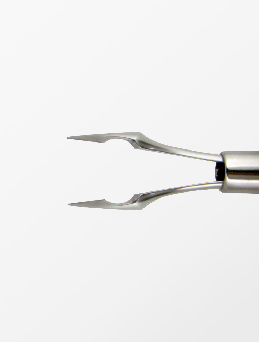 猛禽類のくちばしをイメージしてデザインされた、池田氏マイクロカプスロレキシス鑷子の最新モデル「BEAK」。チップデザインの見直しにより、視認性と操作性が飛躍的に向上しました。チップ内側を深く弧状に削ることで、大きな術野が生まれました。左右に大きく開閉するチップは、その先端に力を集中させて前嚢をしっかりと捉えます。チップ後部には前嚢穿刺用の極小のエッジが設けられ、CCC作成のプロセスを容易にします。