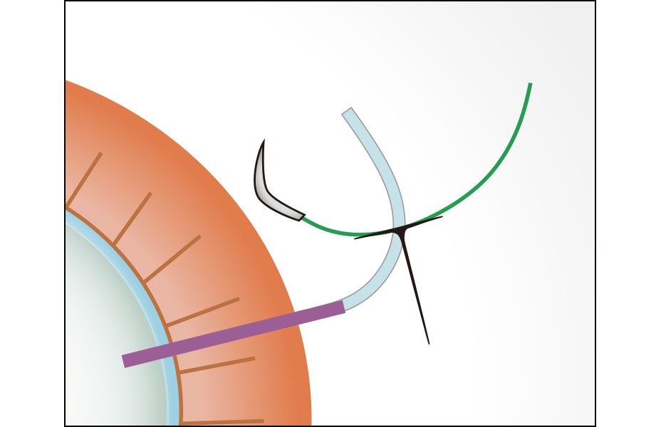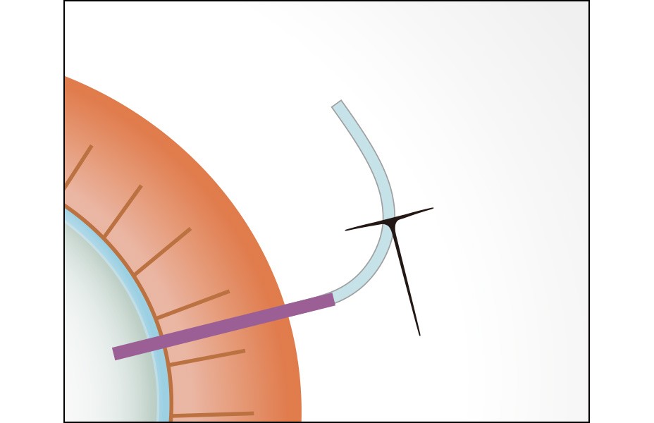 ■T字状の強膜半層切開を行ったのち、IOL支持部を眼外へ引き出すための強膜穿孔創を作成します。