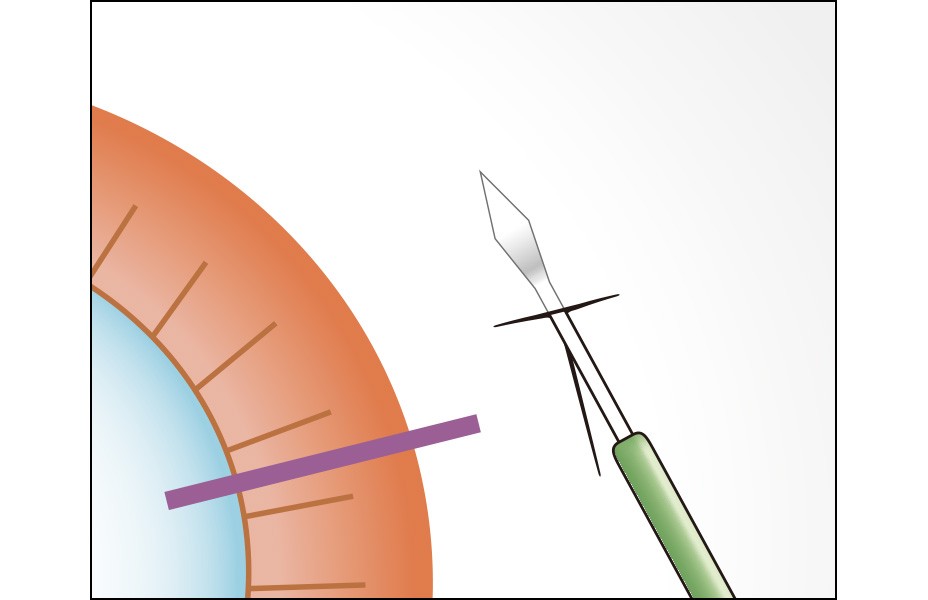 ■24GMVRナイフ(曲)を虹彩に水平に刺入して毛様溝へ至るようにします。