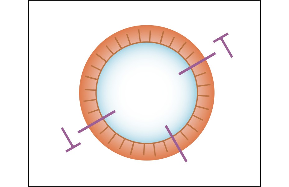 ■2時、8時の強膜上にTマーカーでT字切開のためのマーキングを行います。輪部より2mm離れた位置にマーキングされます。